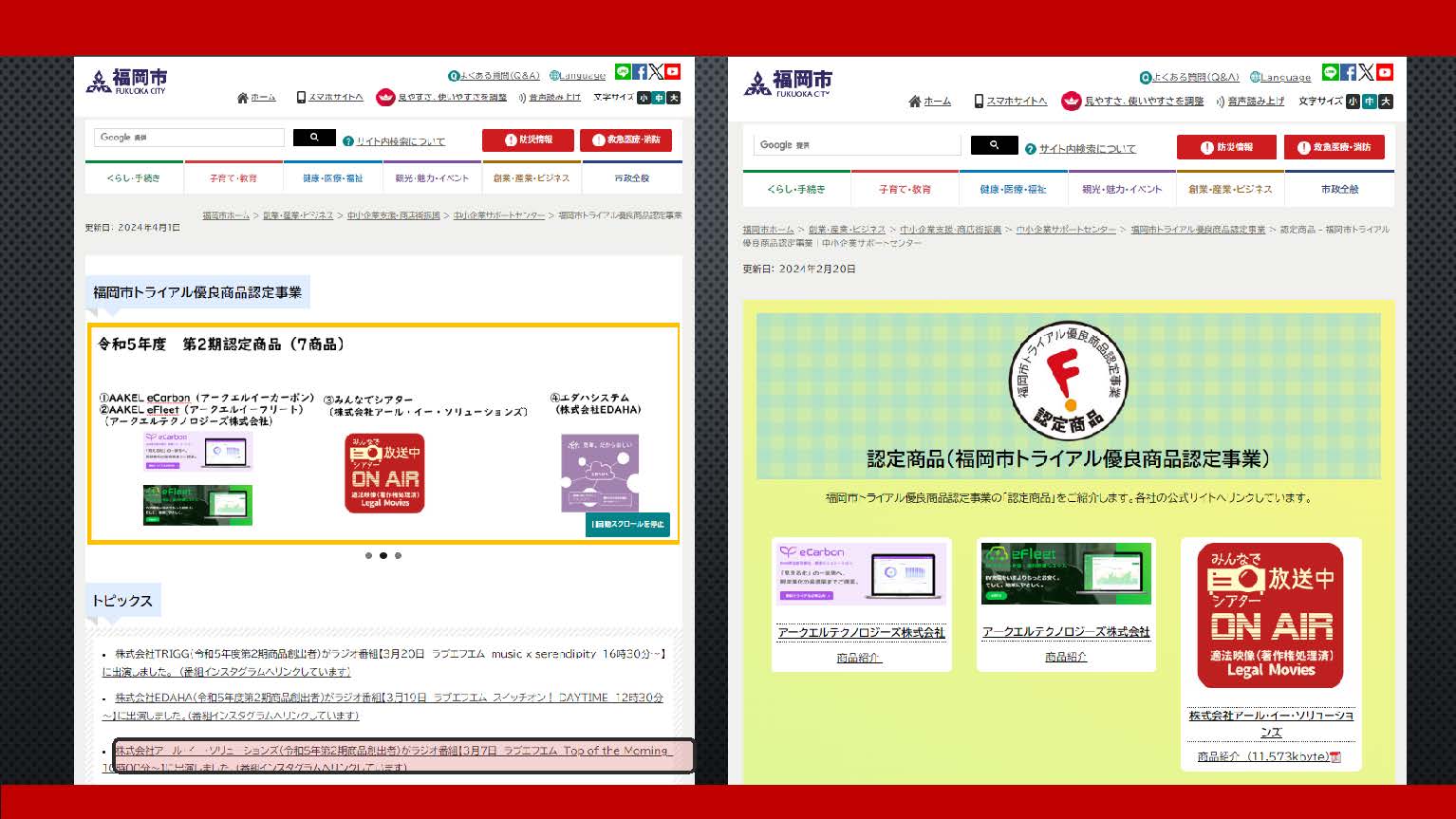 福岡市は、市内の中小企業者が販売又は提供する新規性や独自性のある優れた新商品を福岡市トライアル優良商品として年2回認定し、市がPRすることで中小企業の販路拡大を支援する『福岡市トライアル優良商品認定事業』を行っています。この度、弊社の「みんなでシアター」が令和5年度第2期の認定商品として認定されました。